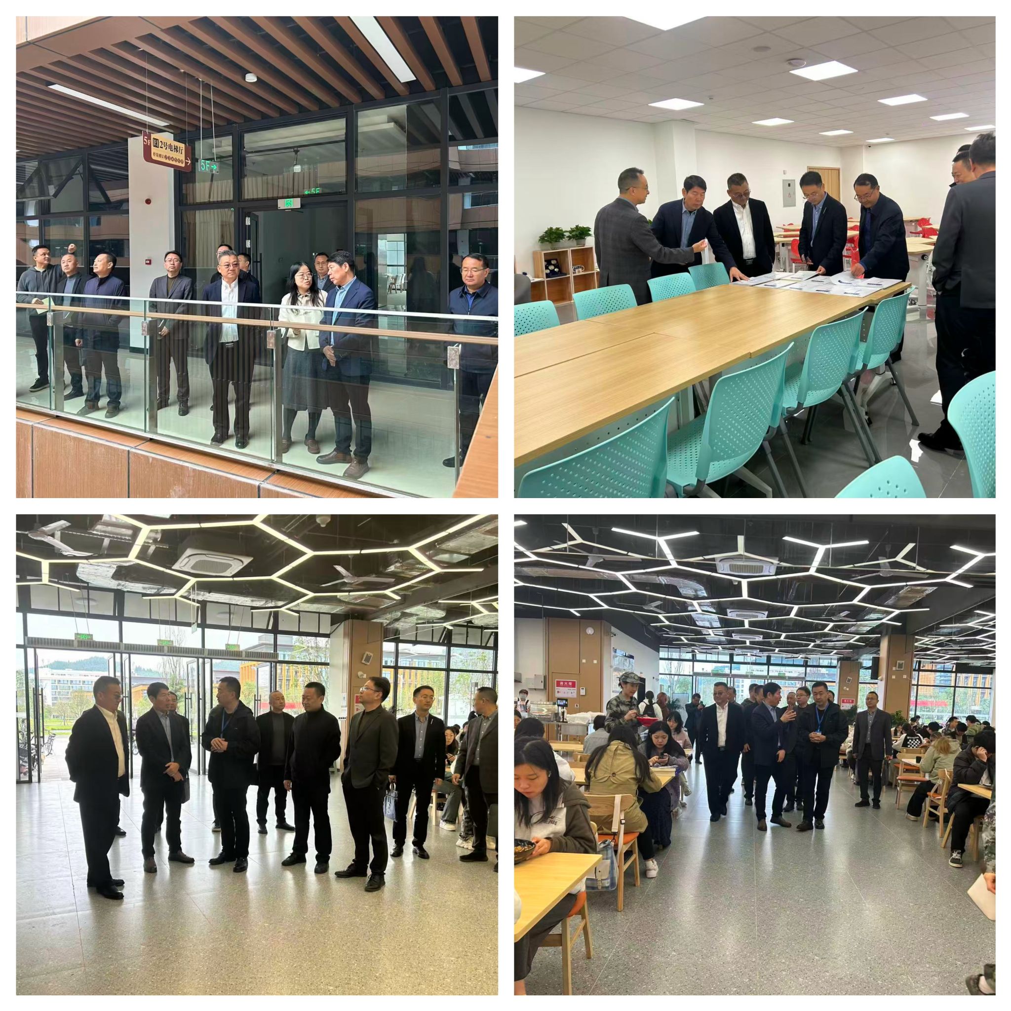 交流会结束后,一行人在图情信息中心(弘医楼)观光走廊全景参观了临江校区,考察调研了瑞园食堂、瑞园学生公寓,详细了解了学校"一站式"学生社区建设规划情况和学生公寓管理服务状况。