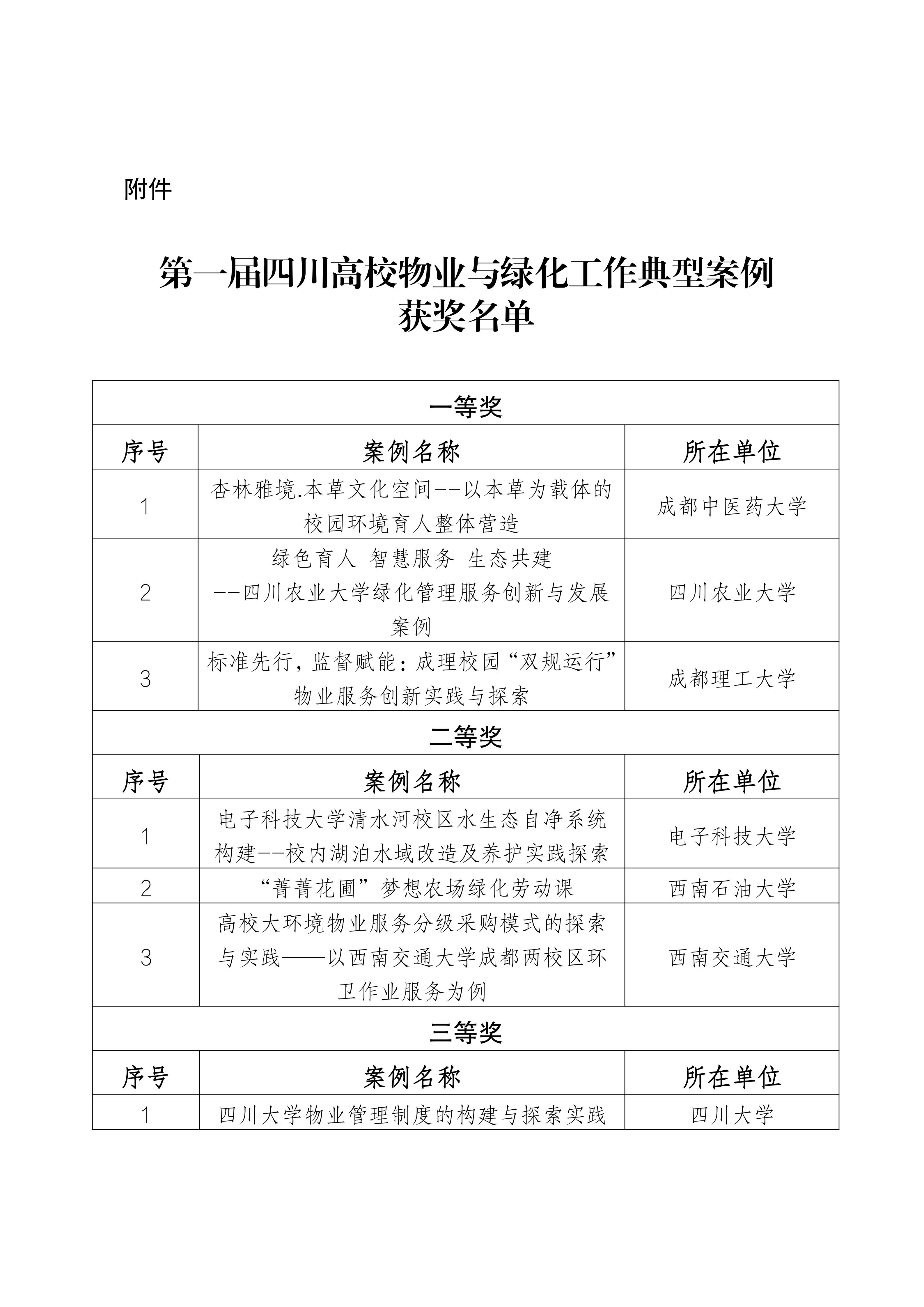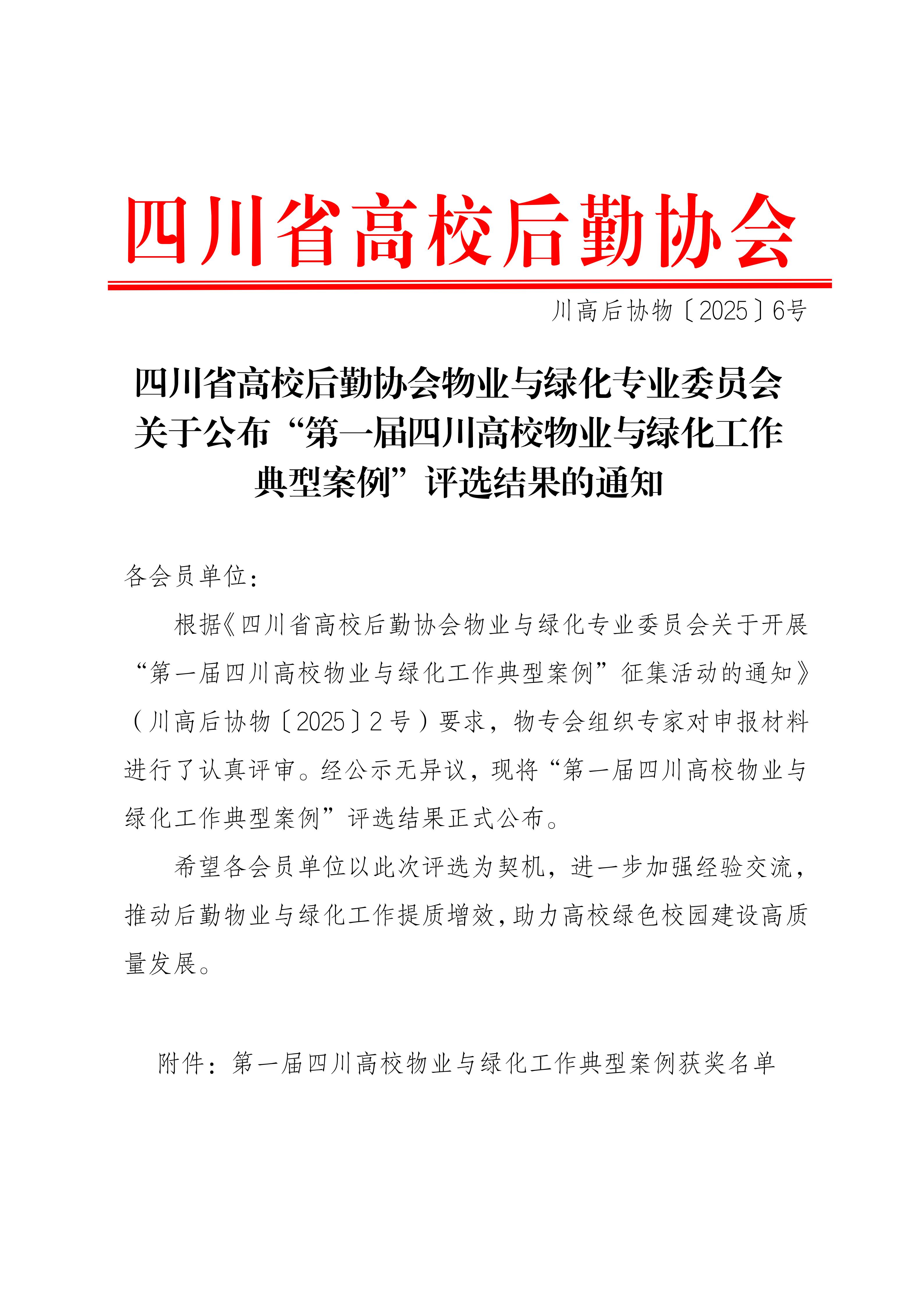 为深入贯彻落实绿色发展理念,推动高校后勤物业与绿化工作高质量发展,近日,四川省高校后勤协会物业与绿化专业委员会(以下简称“物专会”)正式公布“第一届四川高校物业与绿化工作典型案例”评选结果。
