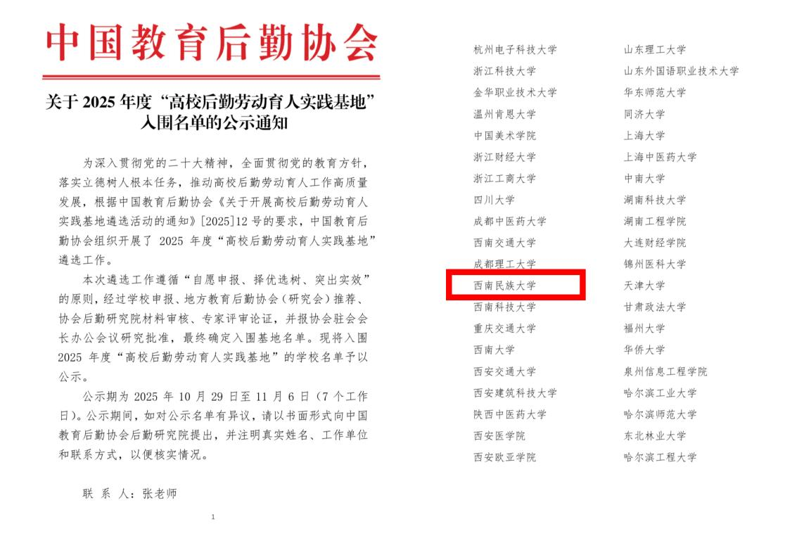 近日,中国教育后勤协会正式公示2025年度“高校后勤劳动育人实践基地”入围名单,西南民族大学凭借在劳动实践育人方面的系统化探索与扎实成效,经自主申报、地方推荐与专家评审等环节,最终成为全国民族高校中唯一入围单位,标志着学校在后勤育人领域的实践成果获得行业高度认可。